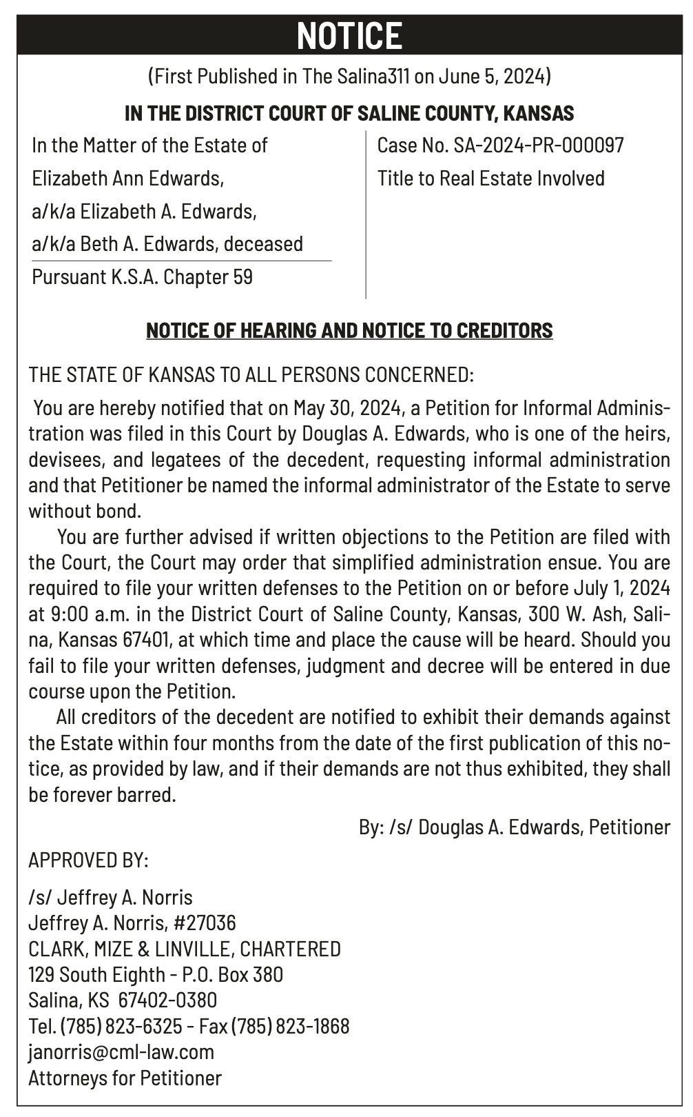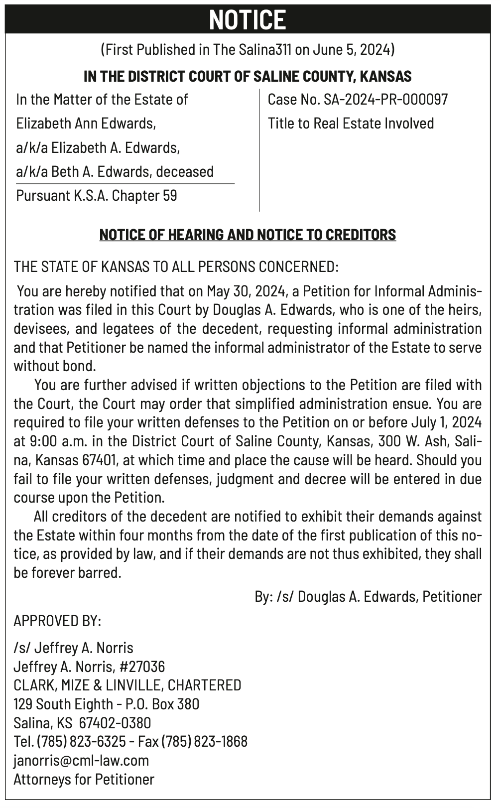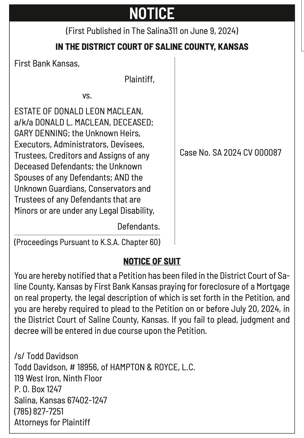Public Notices published in the Salina311 Newspaper on June 12th and June 16th.π‘This story was featured in the Salina311 Newspaper. Subscribe To The Paper