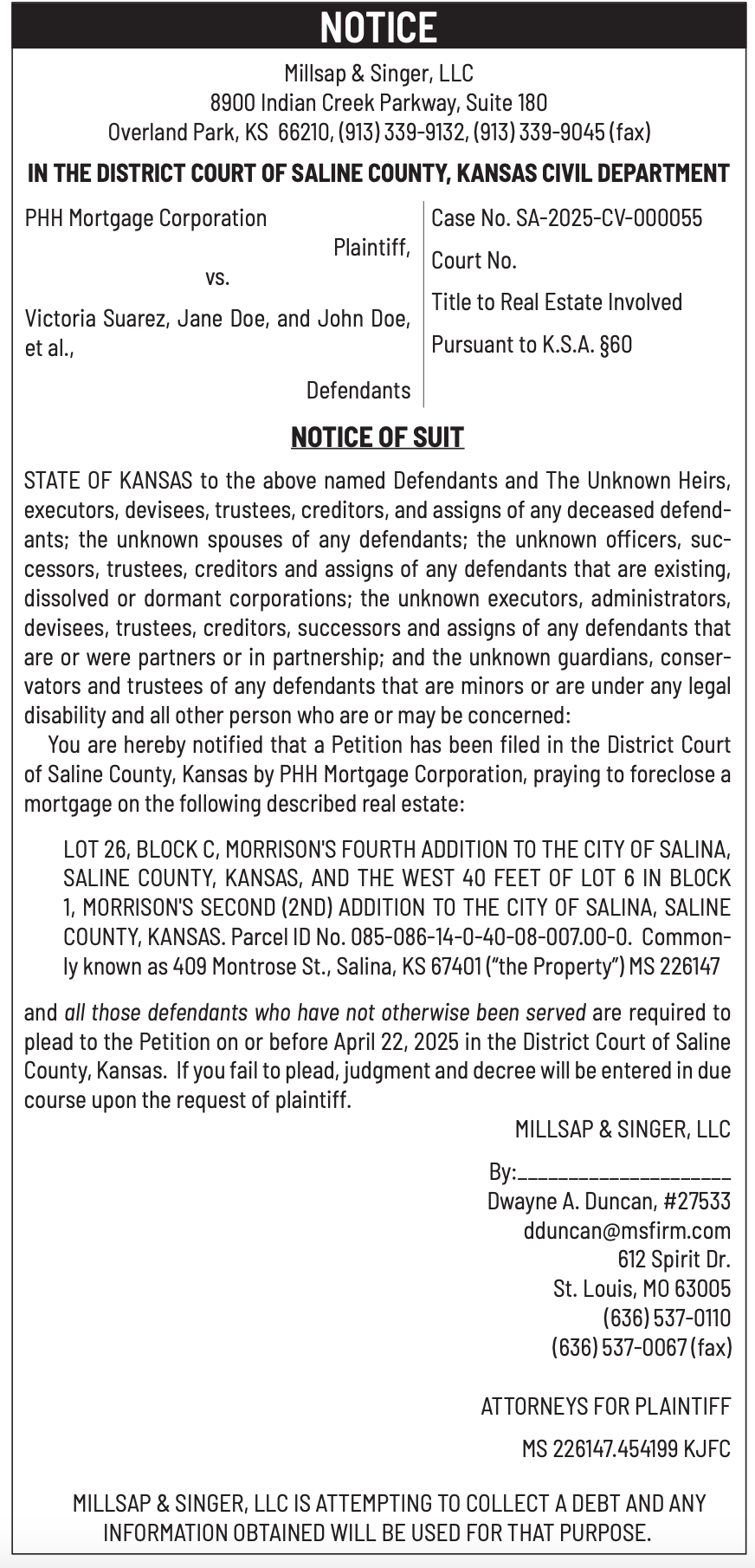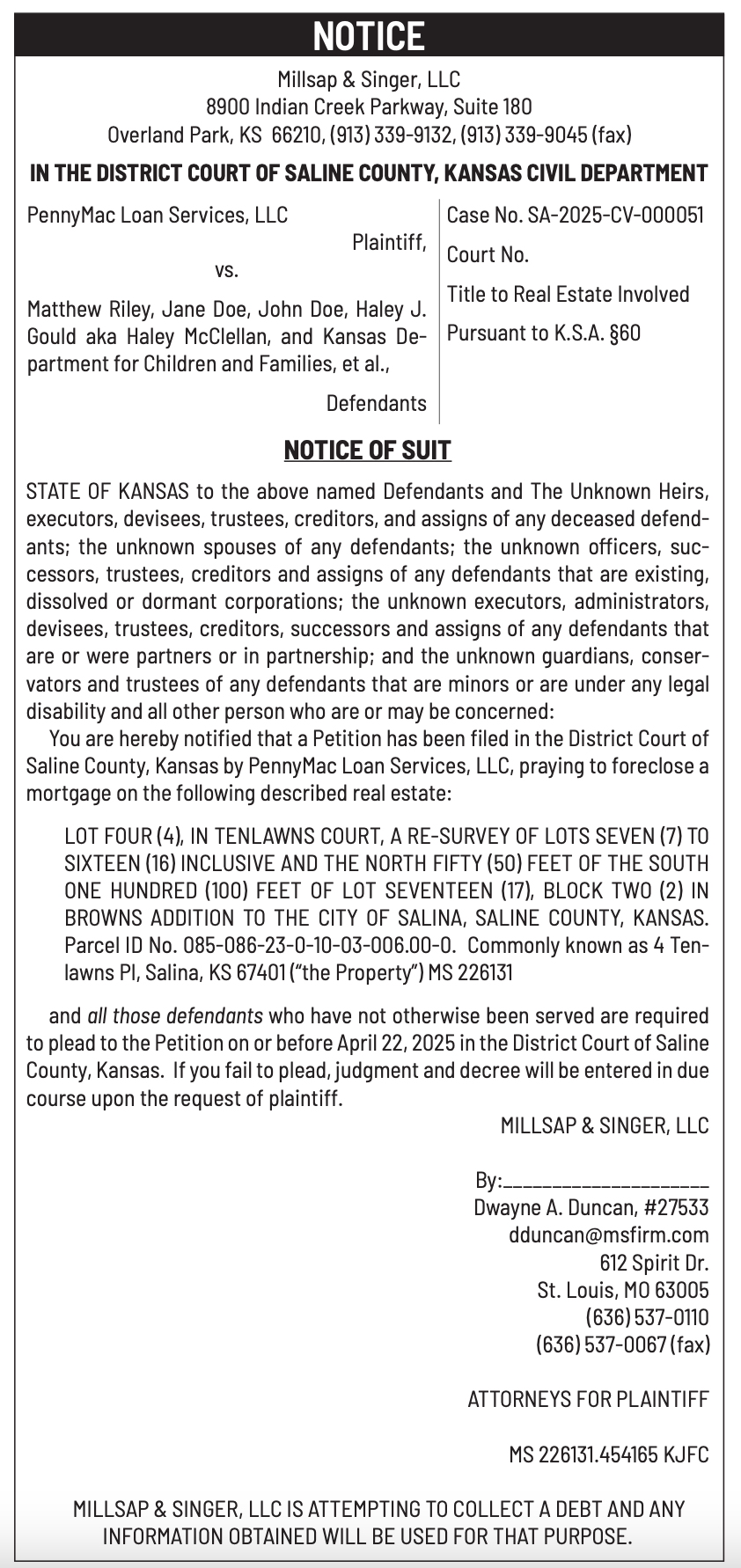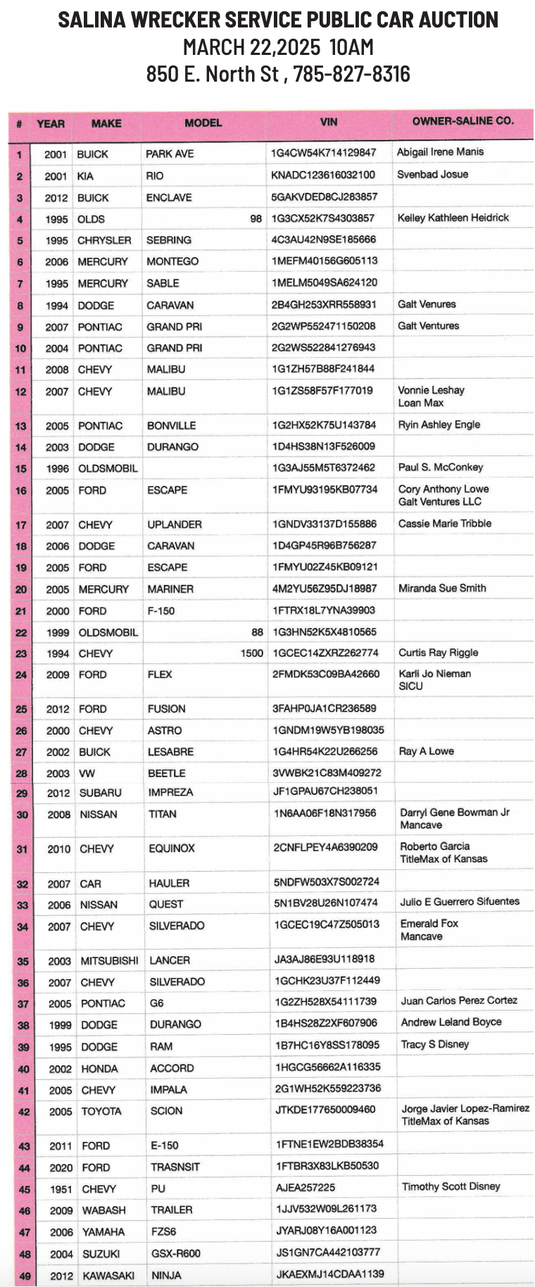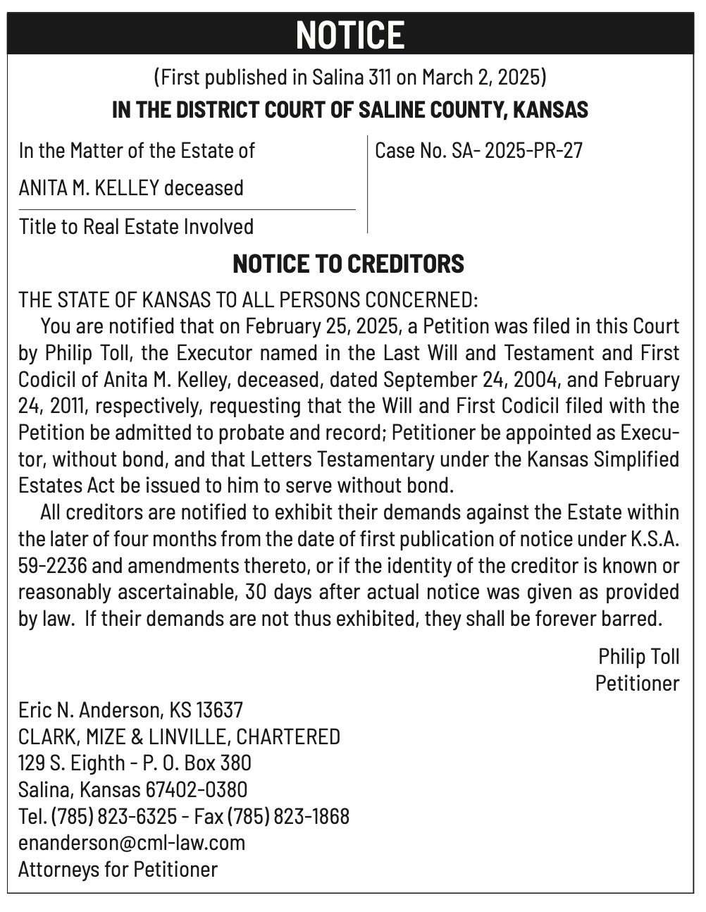Public notices published in the Salina311 Newspaper on March 16th and/or March 12th.
