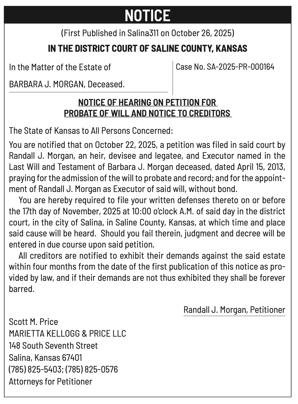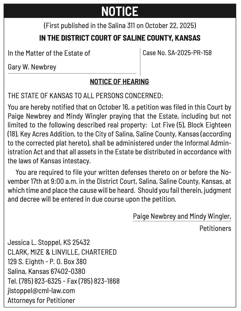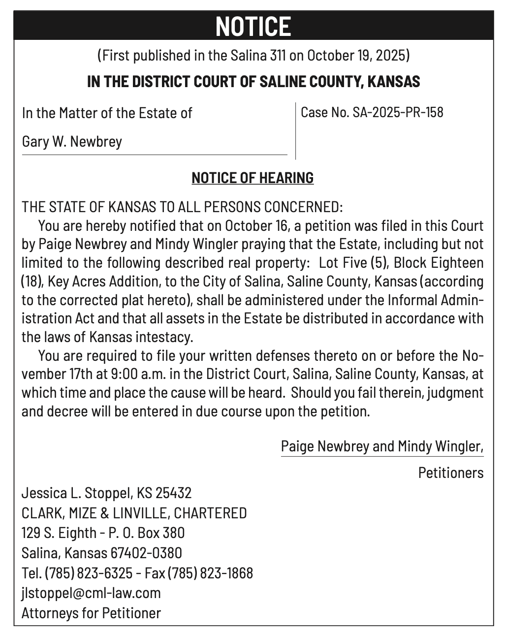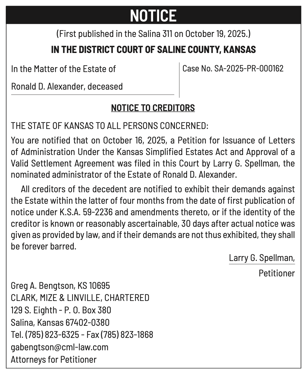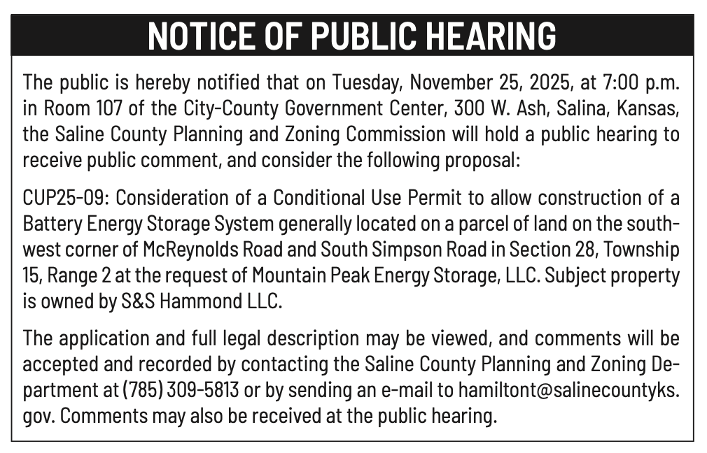 Public notices published in the Salina311 Newspaper on November 2nd and/or October 29, 2025.