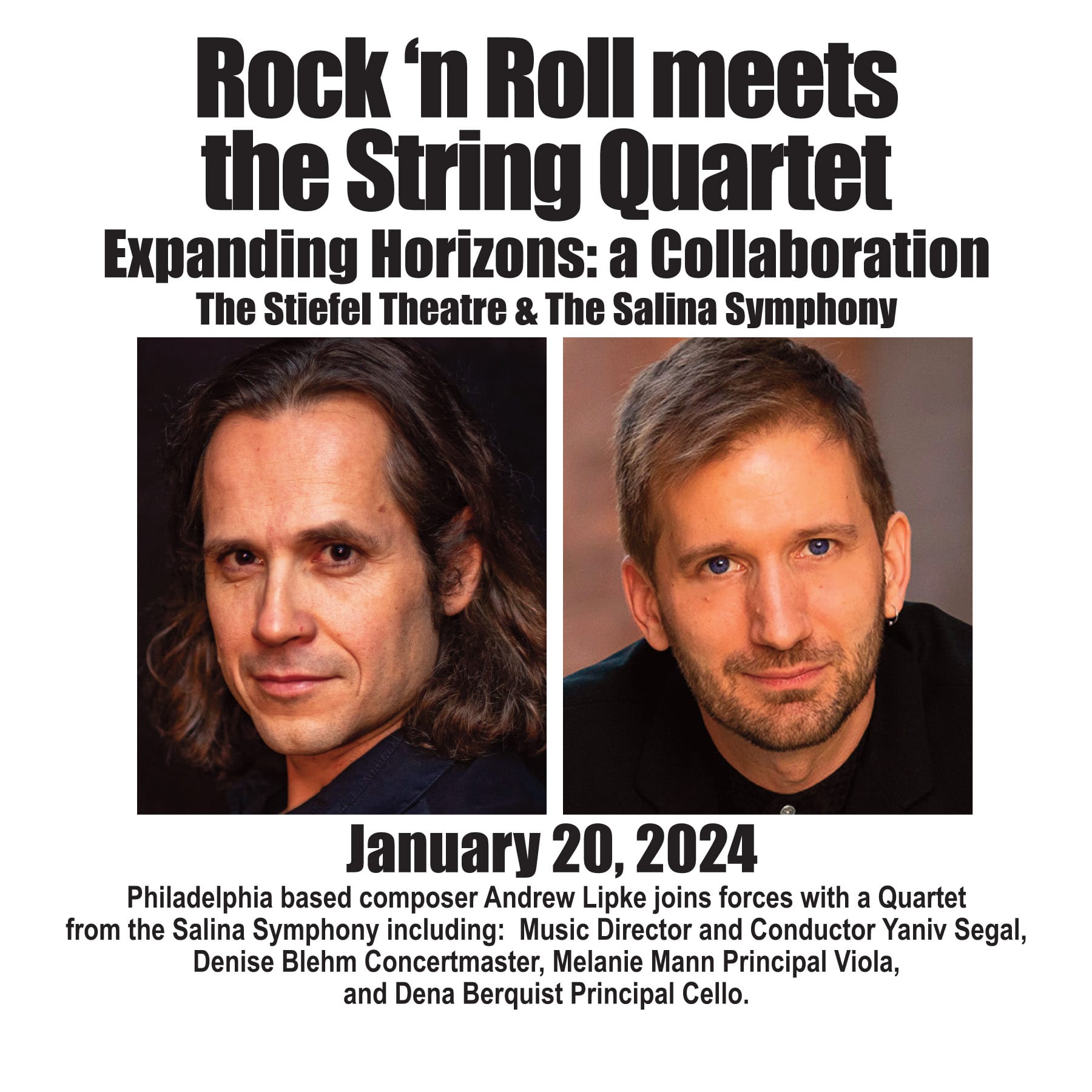 In this exciting new collaboration, The Stiefel Theater, The Salina Symphony and music director Yaniv Segal, and Philadelphia based composer and multi-instrumentalist Andrew Lipke* come together to explore the incredible ways in which music transcends boundaries, lifts the spirit, and constantly surprises and amazes with it’s boundless capacity for expression as a universal language. We blur the imaginary divisions of genre and celebrate the magical essence that is at the core of all great music.Rock ‘n Roll & The String Quartet - we embark on a journey through the amazing history of the String Quartet. One of the most popular, versatile, and revered ensembles in classical music and beyond. With its incomparable agility, inimitable grace, and unparalleled emotional and musical potential, the deceptively simple combination of four instruments - 2 violins, 1 viola, and 1 cello - has been the vehicle for countless composers to practice their art and display their compositional prowess. But even classical music is too small a box to contain this musical force of nature, and we can find the string quartet displaying it's remarkable qualities in dozens of other genres from Jazz to Pop to Rock. In "Rock ‘n Roll & The String Quartet" we not only explore the history of the string quartet in classical music, but we follow it's journey into the world of popular music through discussion and performance of works and arrangements of works by Haydn, Mozart, Beethoven, Bartok, The Beatles, The Rolling Stones, Radiohead, The Velvet Underground, Bob Dylan, Neil young, Philip Glass, and original music by Andrew Lipke. We hope to make this an annual tradition.