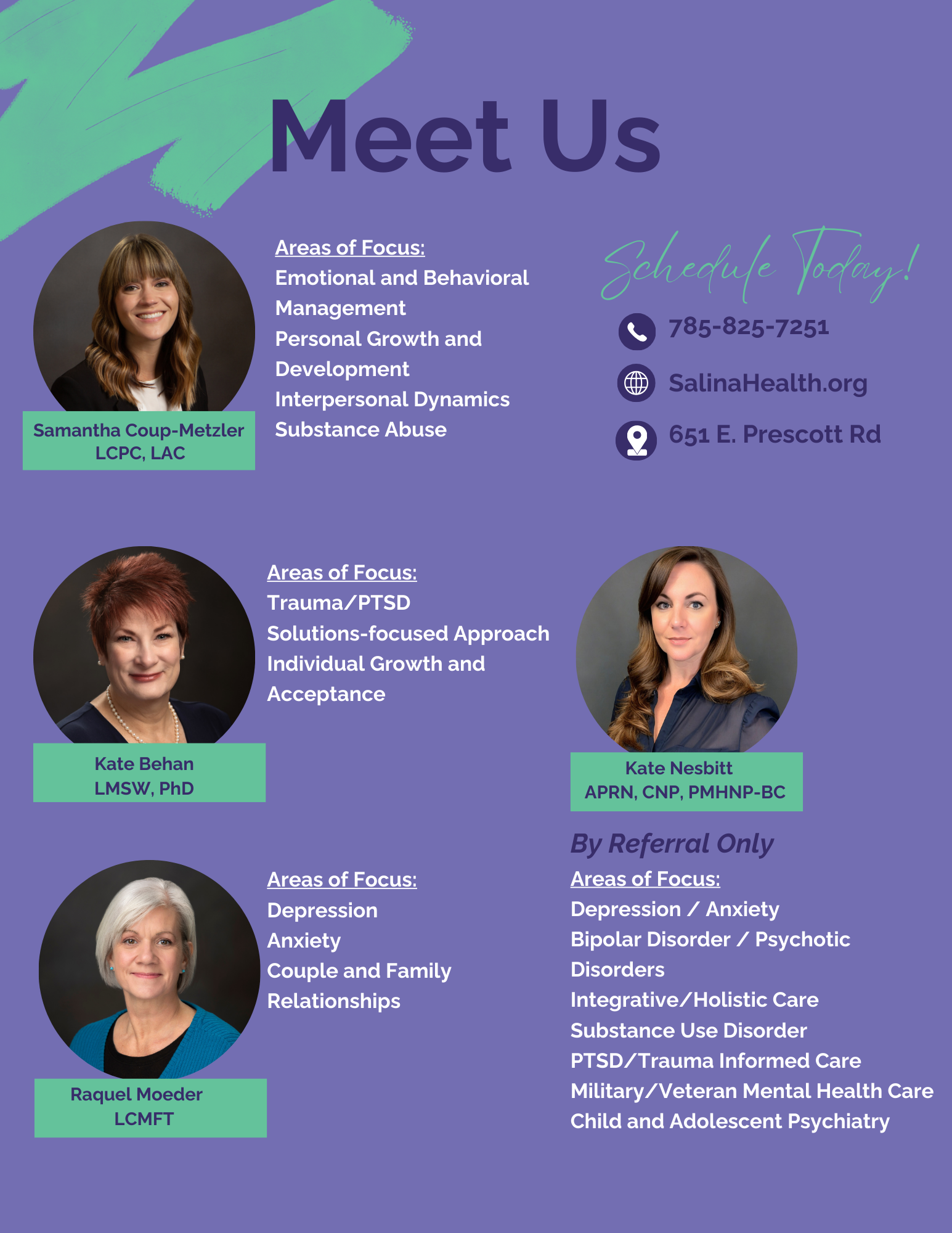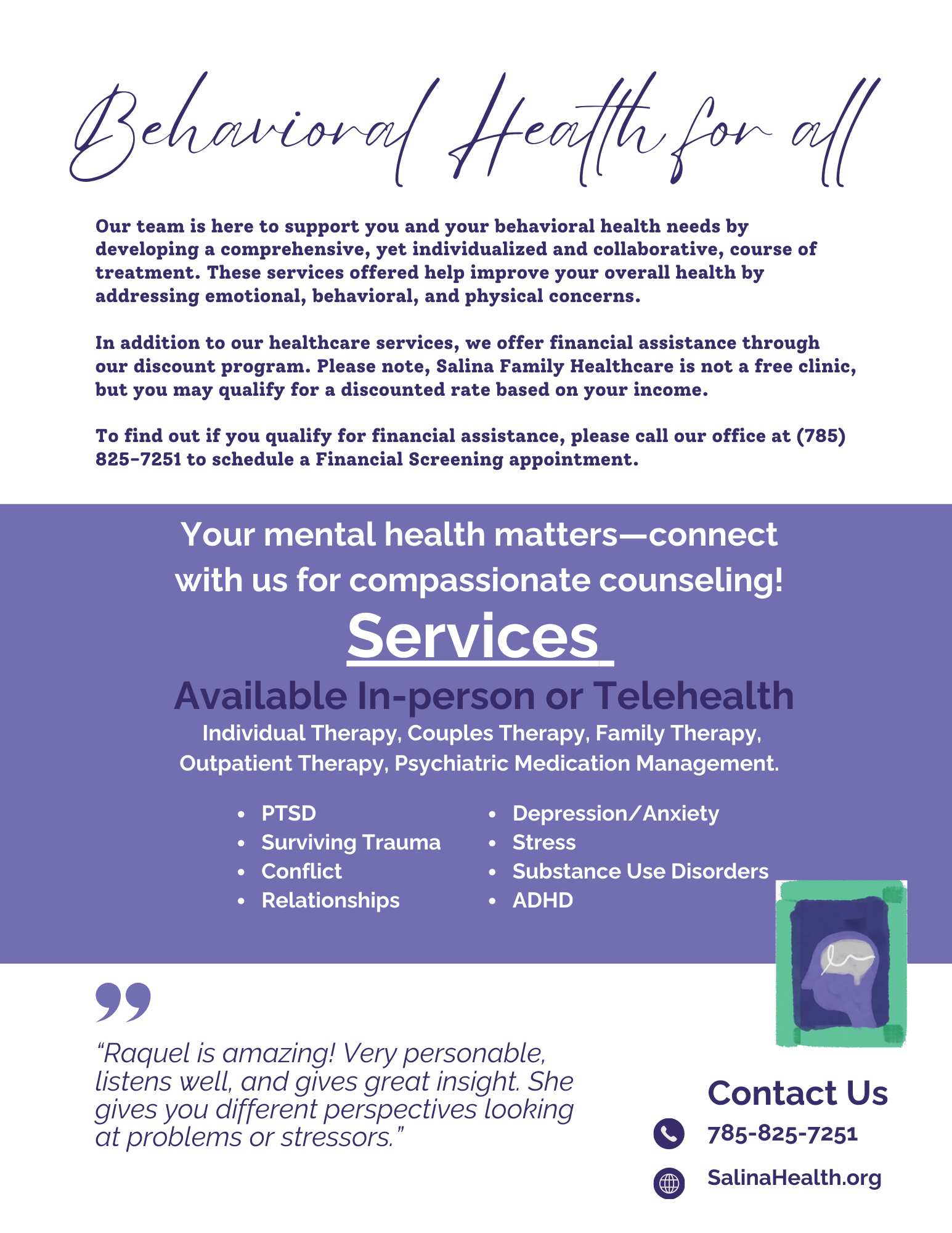 Salina Family Health Center is committed to working alongside the community to address behavioral health needs and ensure that everyone has access to the care they deserve. For more information or to schedule an appointment, please contact us at 785-825-7251.