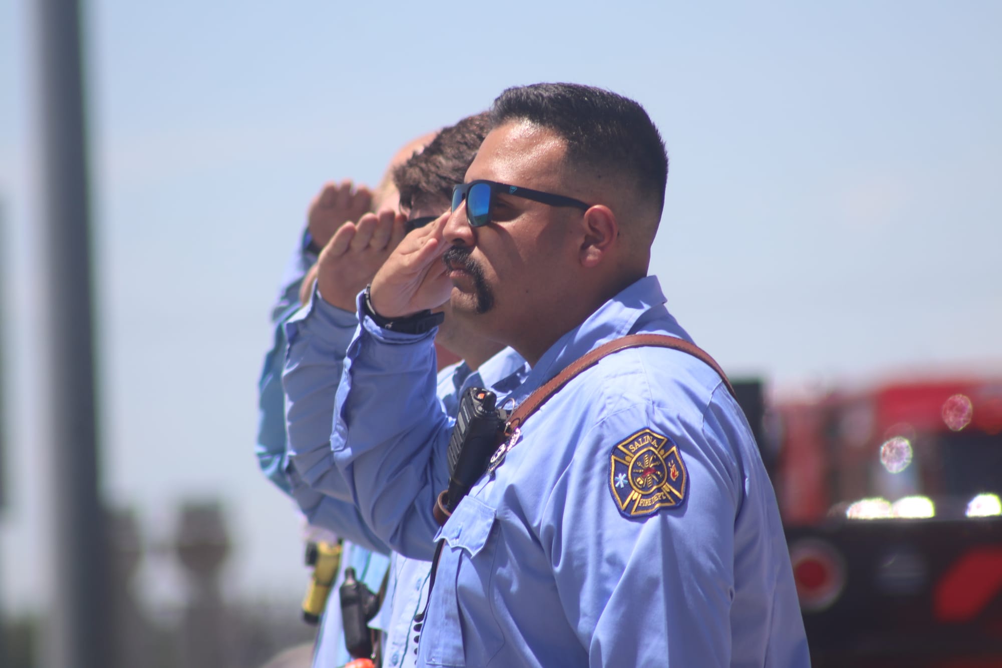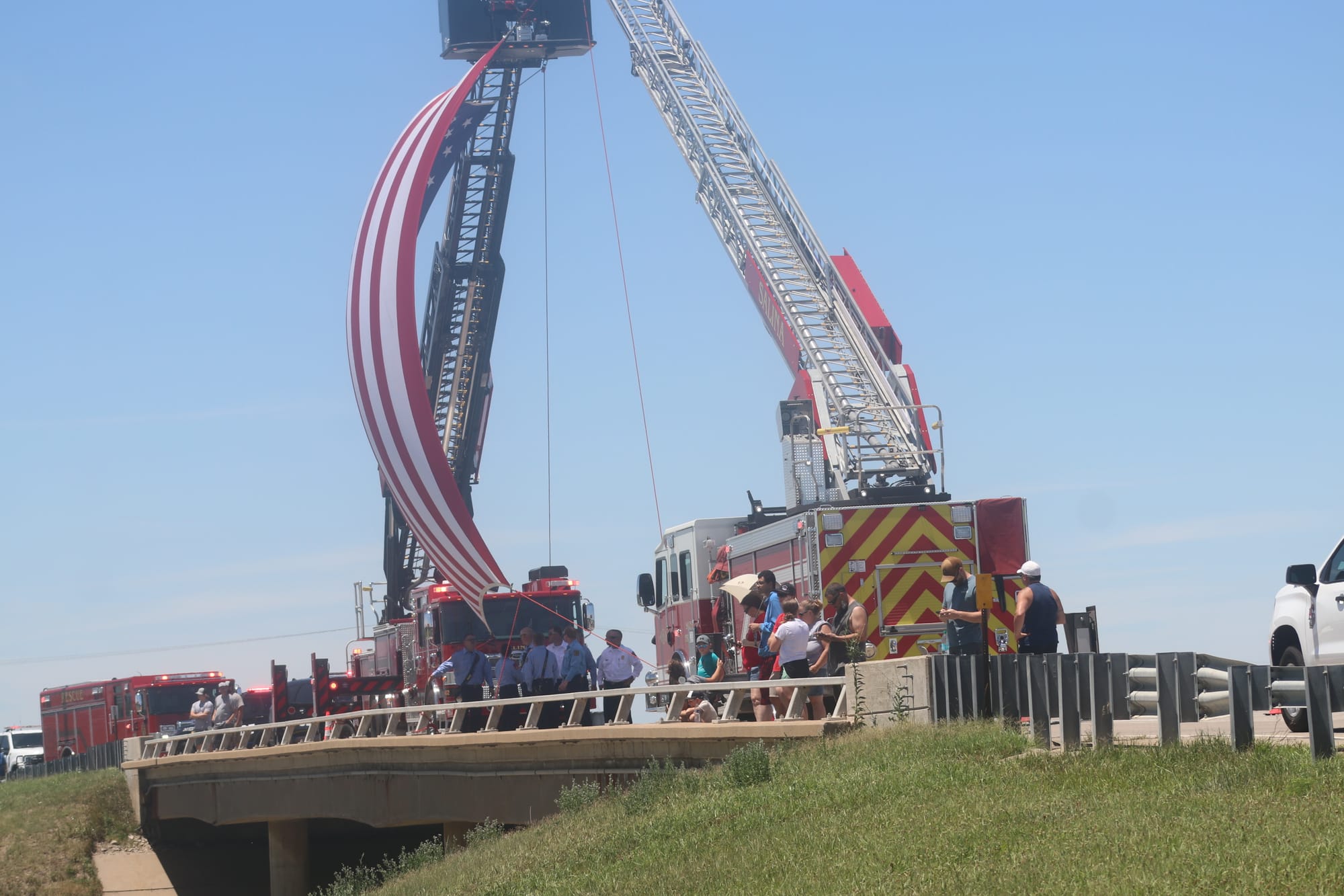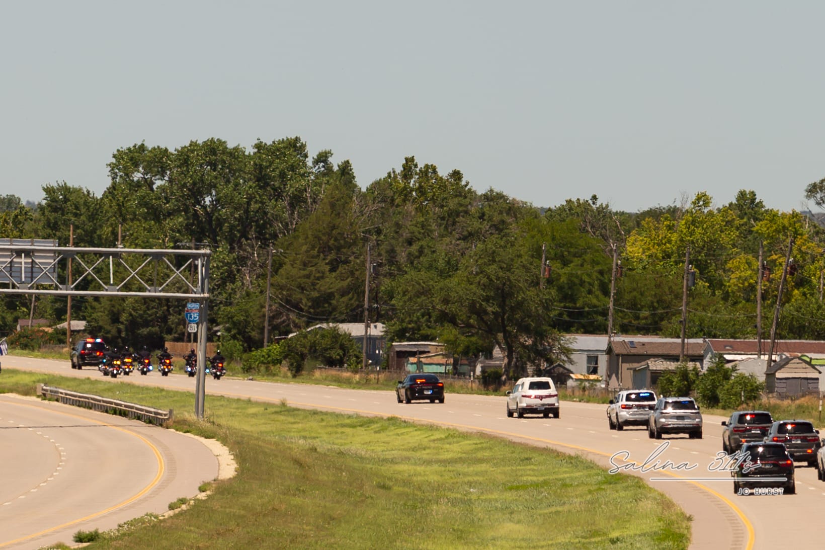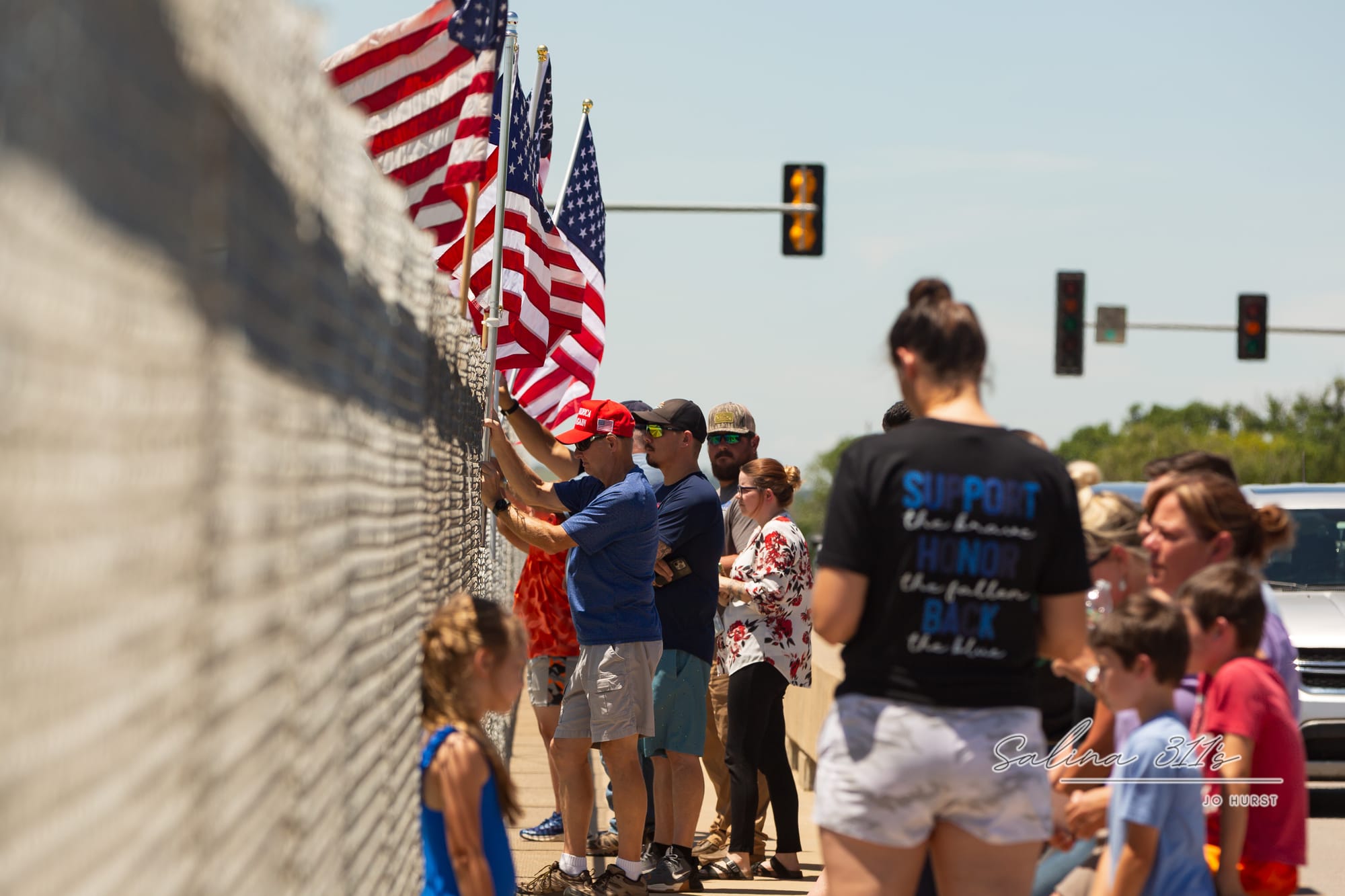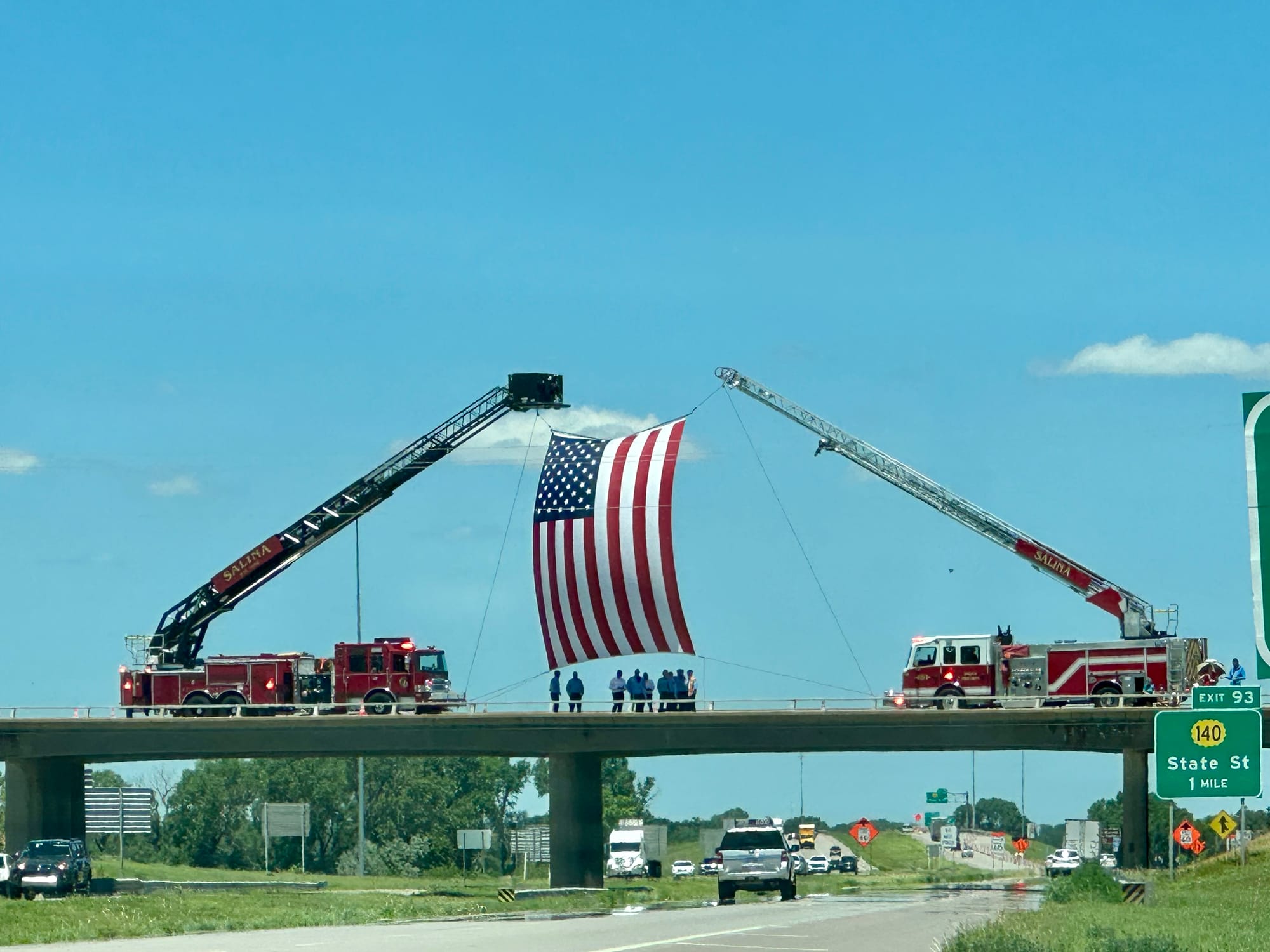 In Salina, firefighters and police officers gathered on the Crawford Street overpass, where they raised a large American flag and stood at attention as the procession passed beneath them. Citizens gathered nearby on the Magnolia overpass, on exit ramps, and on roadside shoulders—many holding flags, all standing silently in honor of a life lost too soon.