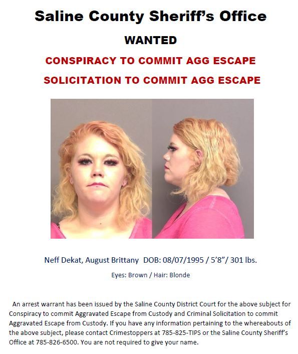 An arrest warrant has been issued by the Saline County District Court for this subject, for Conspiracy to Commit Aggravated Escape from Custody and Criminal Solicitation to Committ Aggravated Escape from Custody. If you have any information pertaining to the whereabouts of the subject, please contact Crimestoppers at 1-785-825-TIPS or the Saline County Sheriff's Office at 1-785-826-6500. You are not required to give your name.