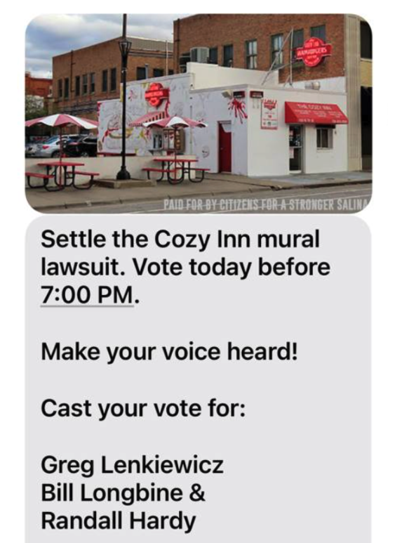 A series of political text messages referencing the Cozy Inn mural lawsuit have circulated to Salina voters in the hours leading up to the final hours of Election Day, urging recipients to “vote today before 7:00 PM” and to “settle the Cozy Inn mural lawsuit.” The messages also name three City Commission candidates — Greg Lenkiewicz, Bill Longbine, and Randall Hardy.