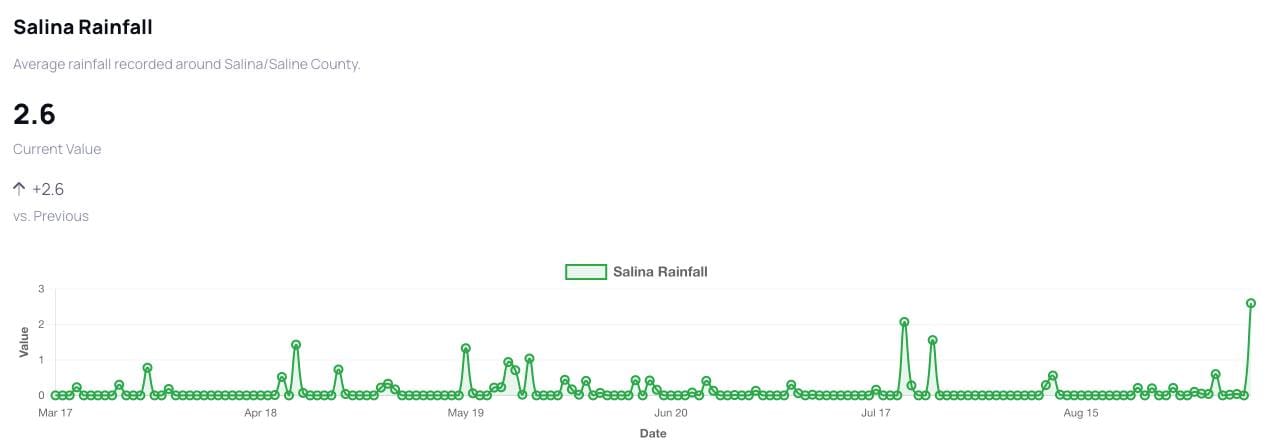Salina has received 2.6 inches of rain in the past six hours, according to the National Weather Service, with measurements recorded at Salina Regional Airport. Total rainfall accumulation is projected to reach 5 to 7 inches.