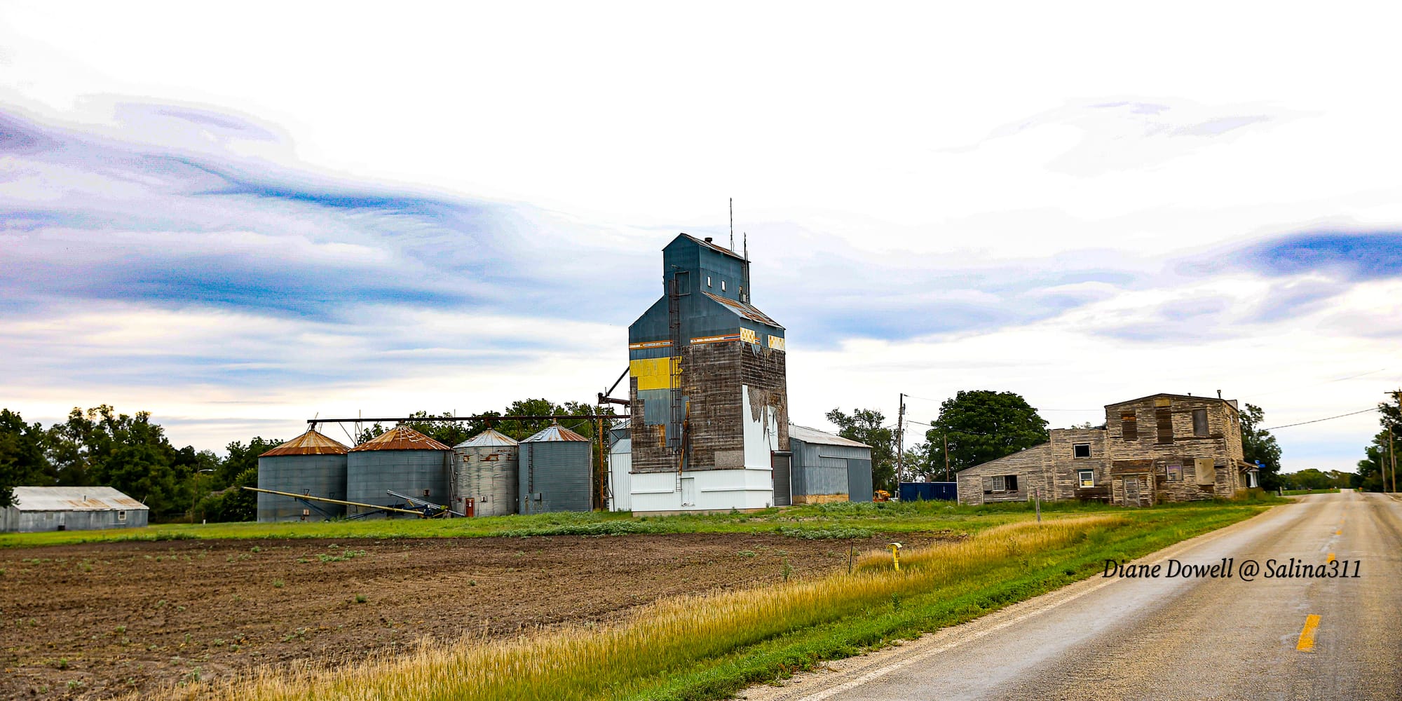Grain bins and elevator sit next to where the railroad line once ran.