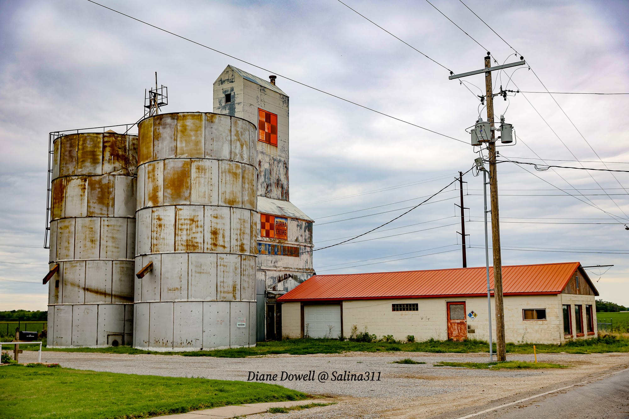 Common in the rural farming communities, elevators and grain bins are also located next to the railroad system.