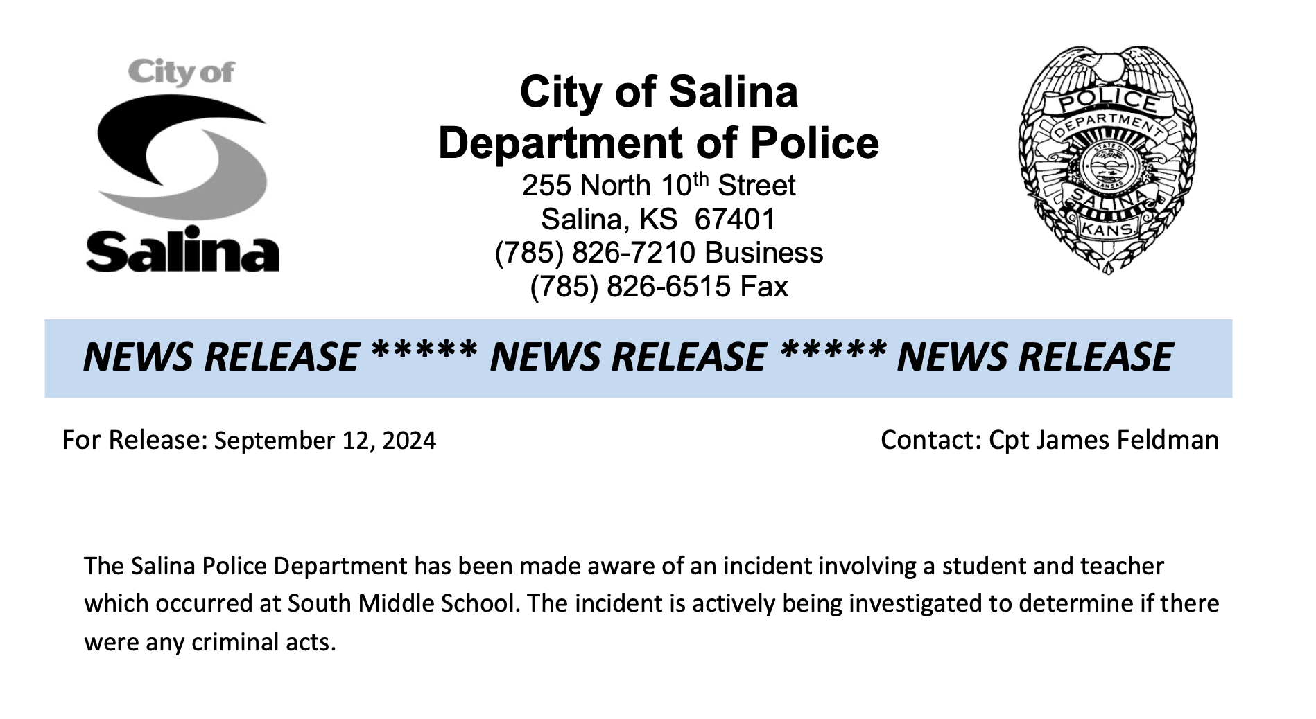 The Salina Police Department (SPD) has released a statement regarding the ongoing investigation into an alleged incident involving a student injury at South Middle School, part of USD 305. Captain James Feldman of the SPD confirmed that the department is actively looking into the case to determine the circumstances surrounding the reported injury that took place during a weightlifting class.