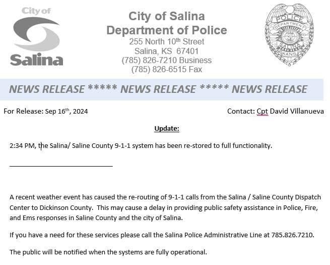 As of 2:34 PM, the Salina/Saline County 9-1-1 system has been fully restored and is now operating normally. Following a temporary re-routing of calls to Dickinson County due to a weather-related event, all emergency services in Saline County and the city of Salina have returned to regular operations.